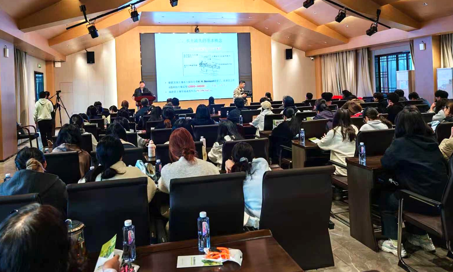 活动以“国家水网世纪画卷——水土安澜护水网,生态协同向未来”为主题,内容丰富、环节紧凑。前期发起的“根植水土,绿动武夷”创意海报征集活动获得热烈响应,优秀作品在活动当天集中展出。专题讲座环节,阮伏水博士以《水土保持与农耕文明》为题,围绕土壤形成、表土与人类文明兴衰的关系、当前面临的挑战及保护对策等方面,系统阐述了水土保育的重要意义与实践路径,讲座后设置的水保知识有奖问答环节,进一步激发了学生的参与热情。为促进知行合一,活动特别组织师生前往校内湖泊开展实地教学。专家结合具体水体,现场讲解水资源保护与水土保持的实践应用,实现从课堂到现场的沉浸式科普,生动诠释了“根植水土、生态育人”的理念。